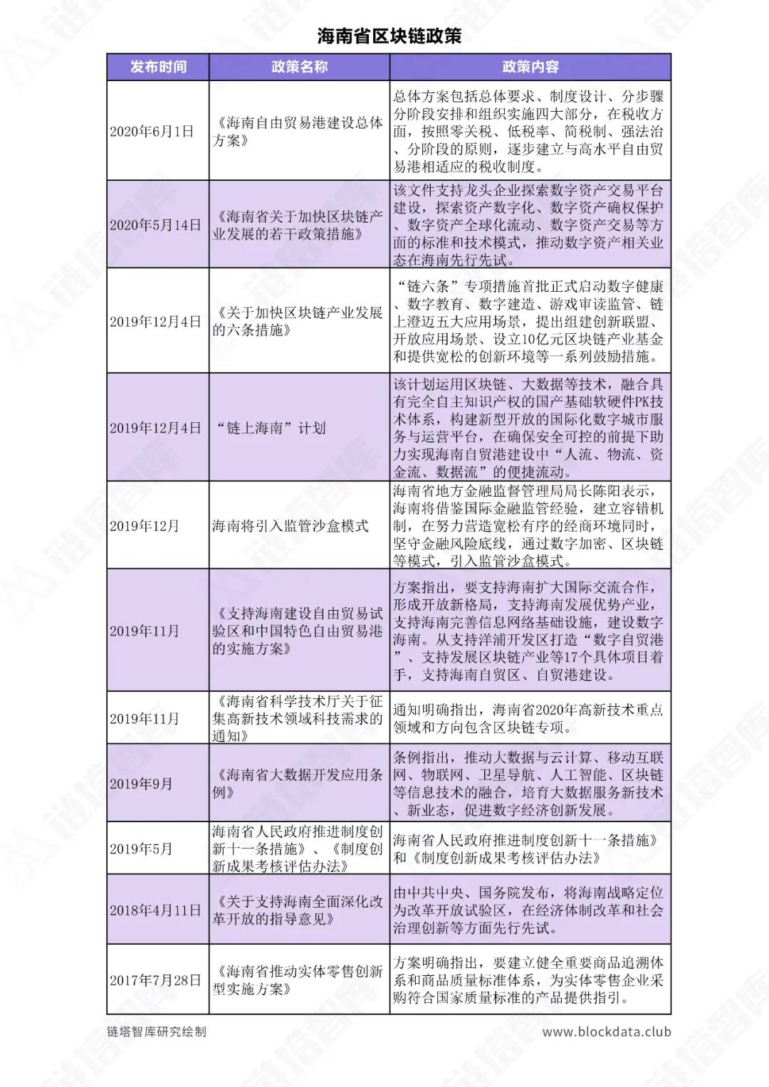 5月,海南省工信厅印发《海南省加快区块链产业发展若干政策措施的通知》,重点提及支持龙头企业探索数字资产交易平台建设,将组建区块链联合创新平台、区块链产业基金;支持区块链基础设施建设;推广旅游消费区块链积分;推动电子政务项目链改;鼓励区块链核心技术研发;实施区块链应用示范揭榜工程;举办世界区块链大会;探索区块链+金融沙箱监管机制;打造区块链产业集群。上述政策试行期限为三年,期满后根据执行评估效果进一步修改完善。
