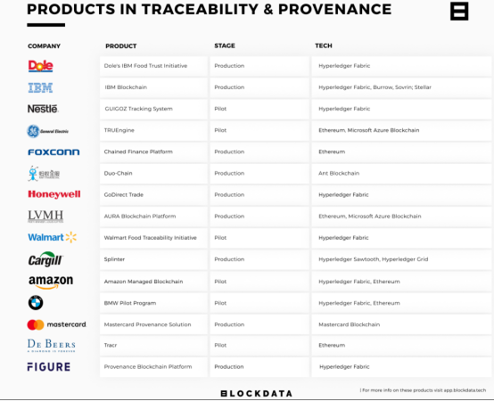我们的数据显示,在福布斯50强榜单中,有15家公司正在研究解决可追溯性和出处有关的产品。这一用例分布在多个行业,包括农业、矿业、航空航天、食品和汽车等。嘉吉公司(Cargill)是美国最大的私营公司,按收入计算,正在开发一个名为Splinter的开源平台。该平台可以在其供应链中实现 "组织之间保持各方隐私前提下的沟通和交易"(利用各种Hyperledger产品,包括Sawtooth、Grid和Transact等)。同样,生产iPhone和Playstations等消费电子产品的合约制造商富士康也在利用区块链技术,通过区块链金融为其供应商简化融资,其中许多供应商都是中小企业。